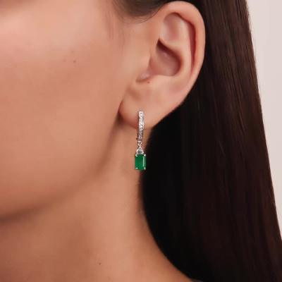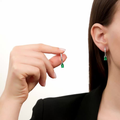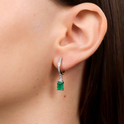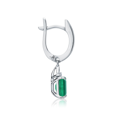 Серьги с 2 бриллиантами природными, 0.08 карат, огранка багет 33 грани, цвет 3, чистота 6, тип огранки А; 20 бриллиантами природными, 0.14 карат, огранка круг 57 граней, цвет 3, чистота 6, тип огранки А; 2 бриллиантами природными, 0.006 карат, огранка круг 17 граней, цвет 2, чистота 2, тип огранки Б; 2 изумрудами природными, 1.81 карат, цвет 3, чистота 3, тип огранки Б; Белое золото 585 пробы.