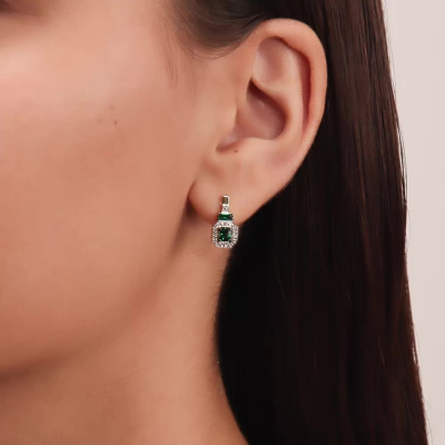 Серьги с 2 бриллиантами природными, 0.01 карат, огранка круг 17 граней, цвет 2, чистота 2, тип огранки Б; 32 бриллиантами природными, 0.12 карат, огранка круг 17 граней, цвет 2, чистота 2, тип огранки А; 2 гидротермальными изумрудами, 0.56 карат; 2 гидротермальными изумрудами, 0.2 карат; Желтое золото 585 пробы.