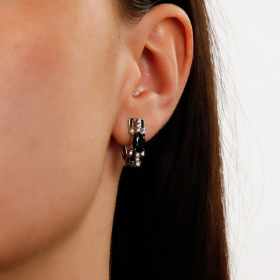 Серьги с 20 бриллиантами природными, 0.17 карат, огранка круг 57 граней, цвет 3, чистота 6, тип огранки А; 2 сапфирами синтетическими, 1.82 карат; Белое золото 585 пробы.