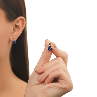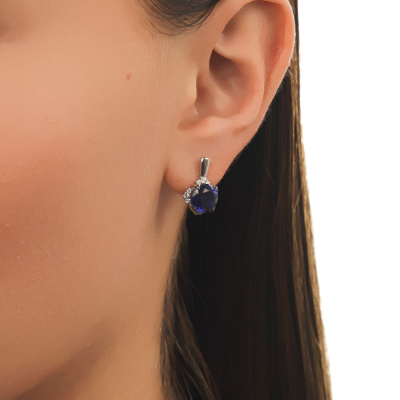 Серьги с 2 сапфирами выращенными, 4.8 карат; 8 бриллиантами выращенными, 0.11 карат, огранка круг 57 граней, цвет 3, чистота 6, тип огранки А; 16 бриллиантами выращенными, 0.11 карат, огранка круг 57 граней, цвет 3, чистота 6, тип огранки А; Белое золото 585 пробы.