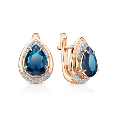 Серьги с 32 бриллиантами природными, 0.07 карат, огранка круг 17 граней, цвет 2, чистота 2, тип огранки А; 2 топазами лондон природными, 2.37 карат; Розовое золото 585 пробы.