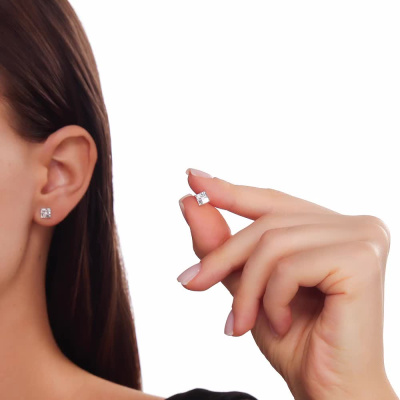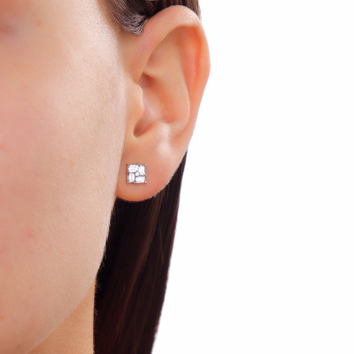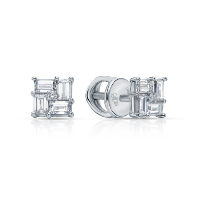 Серьги с 8 бриллиантами выращенными, 0.71 карат, огранка багет 33 грани, цвет 3, чистота 5, тип огранки А; 2 бриллиантами выращенными, 0.02 карат, огранка круг 57 граней, цвет 3, чистота 5, тип огранки А; Белое золото 585 пробы.