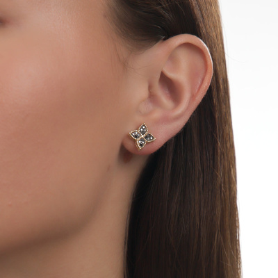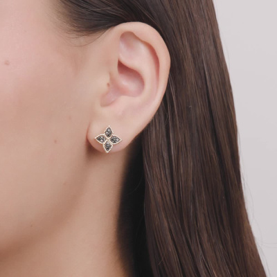 Серьги с 32 бриллиантами черными природными облагороженными, 0.31 карат, огранка круг 57 граней, цвет 7, чистота 6, тип огранки А; Желтое золото 585 пробы.