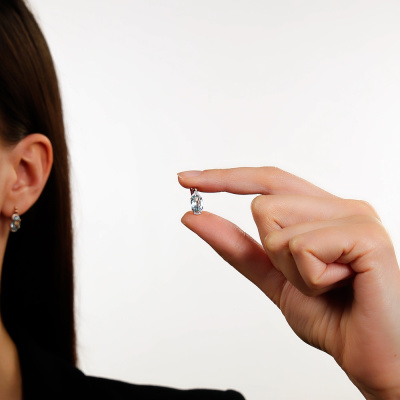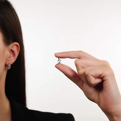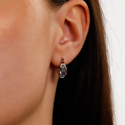Серьги с 20 бриллиантами природными, 0.09 карат, огранка круг 17 граней, цвет 2, чистота 2; 2 топазами скай природными, 2.91 карат; Розовое золото 375 пробы.