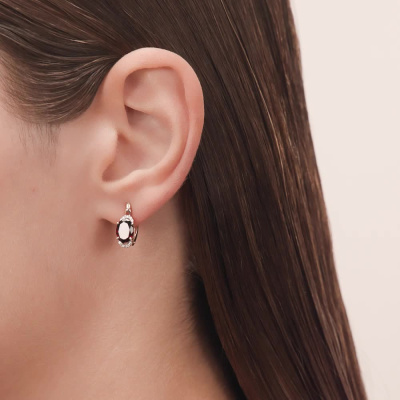 Серьги с 20 бриллиантами природными, 0.09 карат, огранка круг 17 граней, цвет 2, чистота 2, тип огранки А; 2 гранатами природными, 2.94 карат, тип огранки Б; Розовое золото 375 пробы.