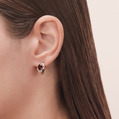 Серьги с 20 бриллиантами природными, 0.09 карат, огранка круг 17 граней, цвет 2, чистота 2; 2 гранатами природными, 1.89 карат; Розовое золото 375 пробы.