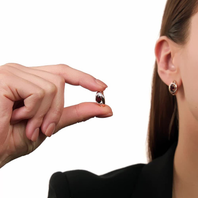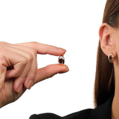 Серьги с 20 бриллиантами природными, 0.09 карат, огранка круг 17 граней, цвет 2, чистота 2; 2 гранатами природными, 1.83 карат; Розовое золото 375 пробы.
