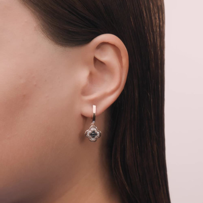 Серьги с 8 бриллиантами природными, 0.02 карат, огранка круг 17 граней, цвет 2, чистота 2, тип огранки А; 2 бриллиантами черными природными облагороженными, 0.04 карат, огранка круг 57 граней, цвет 7, чистота 6, тип огранки А; 8 бриллиантами черными природными облагороженными, 0.06 карат, огранка круг 57 граней, цвет 7, чистота 6, тип огранки А; Розовое золото 585 пробы.