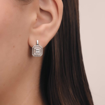 Серьги с 18 бриллиантами природными, 0.12 карат, огранка круг 57 граней, цвет 3, чистота 6, тип огранки А; 56 бриллиантами природными, 0.1 карат, огранка круг 17 граней, цвет 2, чистота 3, тип огранки А; Белое золото 585 пробы.