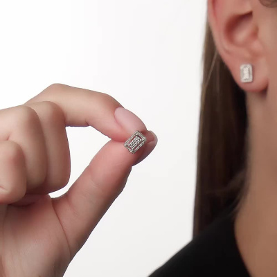 Серьги с 16 бриллиантами природными, 0.11 карат, огранка круг 57 граней, цвет 3, чистота 6, тип огранки А; 52 бриллиантами природными, 0.09 карат, огранка круг 17 граней, цвет 2, чистота 3, тип огранки А; Белое золото 585 пробы.