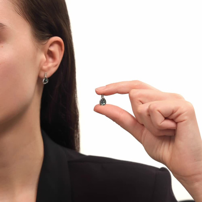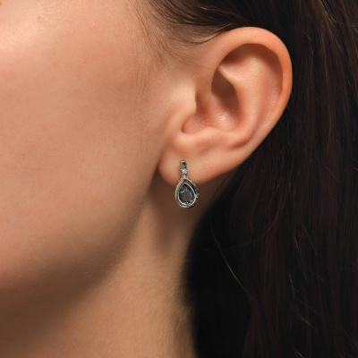 Серьги с 6 бриллиантами природными, 0.03 карат, огранка круг 17 граней, цвет 2, чистота 2, тип огранки А; 2 топазами лондон природными, 1.55 карат; Белое золото 585 пробы.