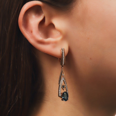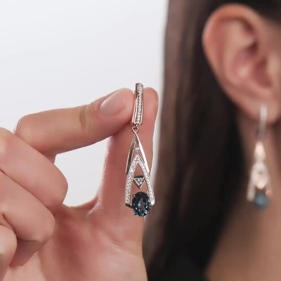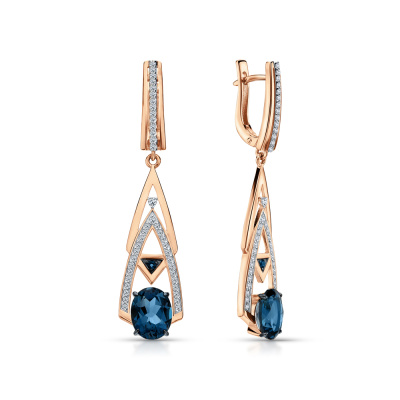 Серьги с 2 бриллиантами природными, 0.02 карат, огранка круг 17 граней, цвет 2, чистота 2, тип огранки А; 2 бриллиантами природными, 0.01 карат, огранка круг 17 граней, цвет 2, чистота 2, тип огранки А; 80 бриллиантами природными, 0.29 карат, огранка круг 17 граней, цвет 2, чистота 2, тип огранки А; 2 топазами лондон природными, 3.93 карат; 2 топазами лондон природными, 0.03 карат; Розовое золото 585 пробы.