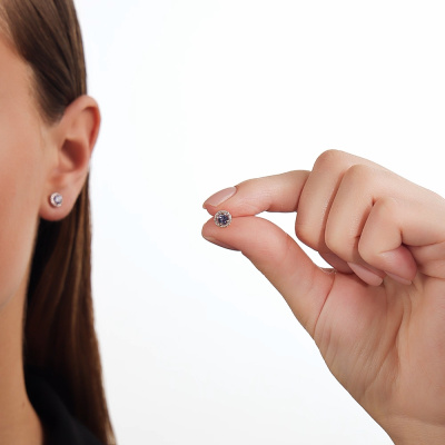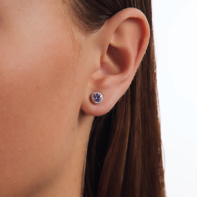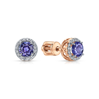 Серьги с 32 бриллиантами природными, 0.06 карат, огранка круг 17 граней, цвет 2, чистота 2, тип огранки А; 2 танзанитами природными, 0.57 карат; Розовое золото 585 пробы.
