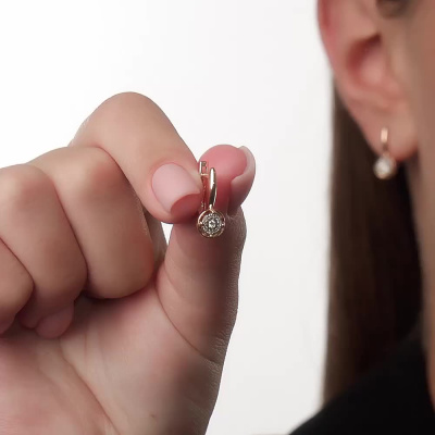 Серьги с 2 бриллиантами природными, 0.02 карат, огранка круг 57 граней, цвет 4, чистота 5, тип огранки А; 24 бриллиантами природными, 0.04 карат, огранка круг 17 граней, цвет 2, чистота 2, тип огранки А; Розовое и белое золото 585 пробы.