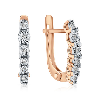 Серьги с 12 бриллиантами природными, 0.05 карат, огранка круг 17 граней, цвет 2, чистота 2, тип огранки А; Розовое и белое золото 585 пробы.