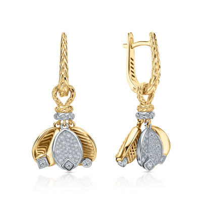 Серьги с 6 бриллиантами природными, 0.08 карат, огранка круг 57 граней, цвет 3, чистота 6, тип огранки А; 14 бриллиантами природными, 0.1 карат, огранка круг 57 граней, цвет 3, чистота 6, тип огранки А; 58 бриллиантами природными, 0.13 карат, огранка круг 57 граней, цвет 3, чистота 6, тип огранки А; Желтое и белое золото 585 пробы.