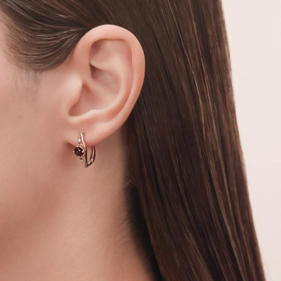 Серьги с 4 бриллиантами природными, 0.03 карат, огранка круг 57 граней, цвет 3, чистота 6, тип огранки А; 2 гранатами природными, 1.31 карат, тип огранки В; Розовое золото 375 пробы.
