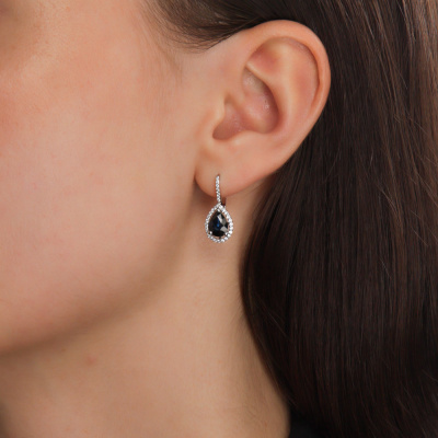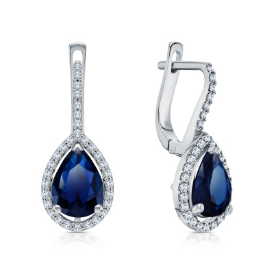 Серьги с 62 бриллиантами природными, 0.26 карат, огранка круг 57 граней, цвет 3, чистота 4, тип огранки А; 2 сапфирами природными, 1.95 карат, цвет 2, чистота 2, тип огранки Б; Белое золото 585 пробы.