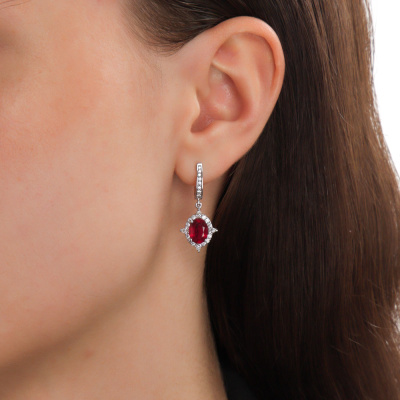 Серьги с 8 бриллиантами природными, 0.23 карат, огранка груша 56 граней, цвет 3, чистота 5, тип огранки А; 40 бриллиантами природными, 0.4 карат, огранка круг 57 граней, цвет 3, чистота 5, тип огранки А; 2 рубинами природными, 4.06 карат, цвет 2, чистота 3, тип огранки Б; Белое золото 585 пробы.