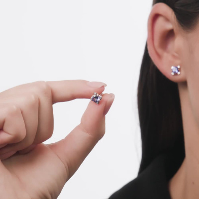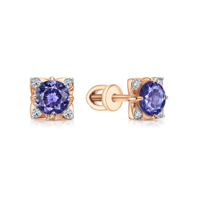 Серьги с 8 бриллиантами природными, 0.06 карат, огранка круг 57 граней, цвет 3, чистота 6, тип огранки А; 2 танзанитами природными, 1.05 карат; Розовое золото 585 пробы.
