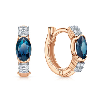 Серьги с 16 бриллиантами природными, 0.06 карат, огранка круг 17 граней, цвет 2, чистота 2, тип огранки А; 2 топазами лондон природными, 0.57 карат; Розовое золото 585 пробы.