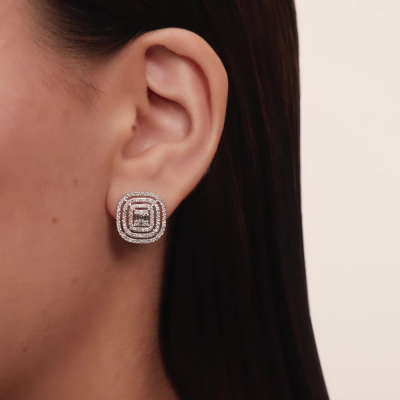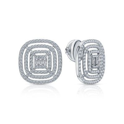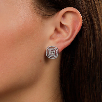 Серьги с 6 бриллиантами природными, 0.21 карат, огранка багет 25 граней, цвет 3, чистота 5, тип огранки А; 196 бриллиантами природными, 0.72 карат, огранка круг 17 граней, цвет 2, чистота 3, тип огранки А; Белое золото 585 пробы.