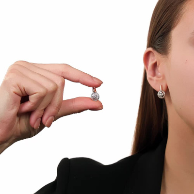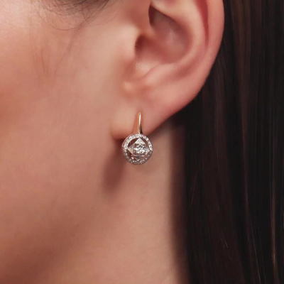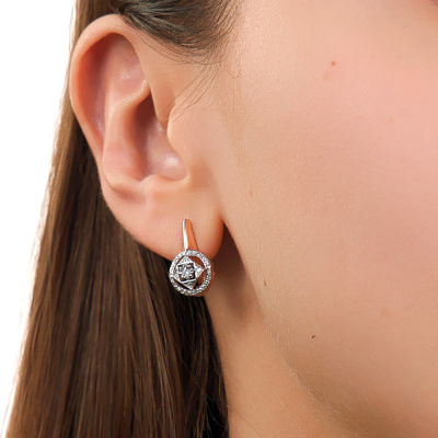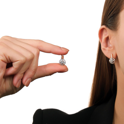 Серьги с 2 бриллиантами природными, 0.01 карат, огранка круг 57 граней, цвет 3, чистота 6; 56 бриллиантами природными, 0.19 карат, огранка круг 17 граней, цвет 2, чистота 2; Розовое и белое золото 585 пробы.