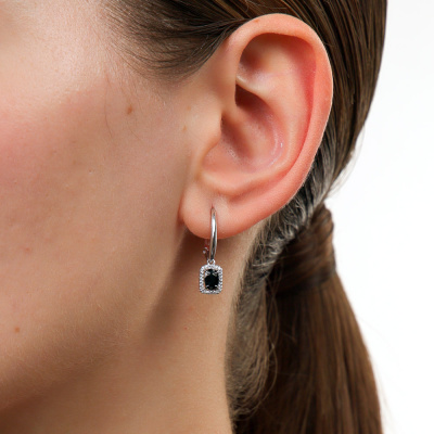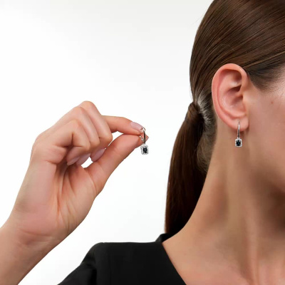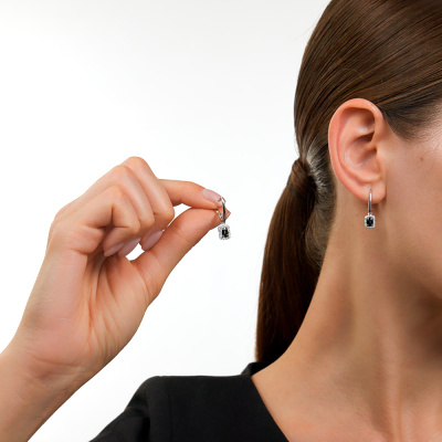 Серьги с 48 бриллиантами природными, 0.08 карат, огранка круг 17 граней, цвет 2, чистота 2, тип огранки А; 2 сапфирами природными, 1.07 карат, цвет 2, чистота 2, тип огранки Б; Белое золото 585 пробы.