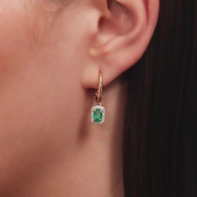 Серьги с 48 бриллиантами природными, 0.08 карат, огранка круг 17 граней, цвет 2, чистота 2, тип огранки А; 2 изумрудами природными, 0.88 карат, цвет 3, чистота 3, тип огранки Б; Розовое золото 585 пробы.