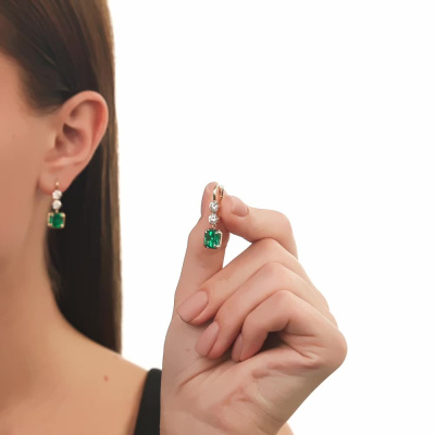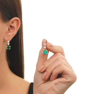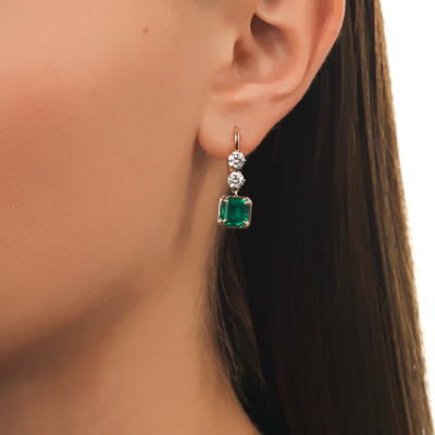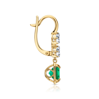 Серьги с 2 изумрудами выращенными Колумбия, 2.88 карат; 4 бриллиантами выращенными, 1.32 карат, огранка круг 57 граней, цвет 3, чистота 6, тип огранки А; Желтое золото 585 пробы.
