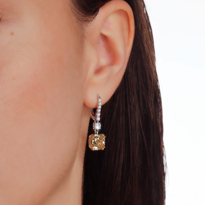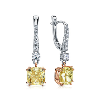Серьги с 2 бриллиантами выращенными, 5.45 карат, огранка кушон 57 граней, цвет Желтый, чистота 5, тип огранки А; 2 бриллиантами выращенными, 0.39 карат, огранка круг 57 граней, цвет 3, чистота 5, тип огранки А; 4 бриллиантами выращенными, 0.07 карат, огранка круг 57 граней, цвет 3, чистота 5, тип огранки А; 4 бриллиантами выращенными, 0.06 карат, огранка круг 57 граней, цвет 3, чистота 4, тип огранки А; 4 бриллиантами выращенными, 0.02 карат, огранка круг 57 граней, цвет 3, чистота 5, тип огранки А; Желтое и белое золото 585 пробы.