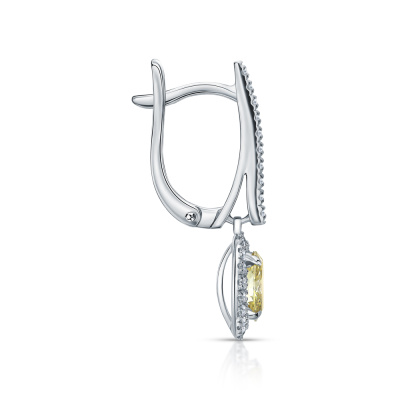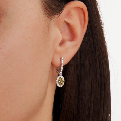 Серьги с 2 бриллиантами выращенными, 0.96 карат, огранка овал 57 граней, цвет Желтый, чистота 5, тип огранки А; 56 бриллиантами выращенными, 0.35 карат, огранка круг 57 граней, цвет 3, чистота 5, тип огранки А; Белое золото 585 пробы.