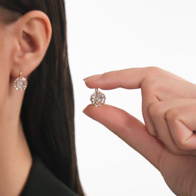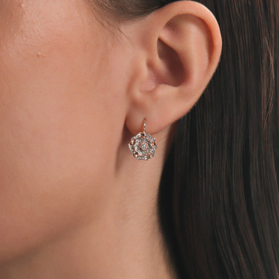 Серьги с 2 бриллиантами природными, 0.07 карат, огранка круг 57 граней, цвет 3, чистота 6, тип огранки А; 70 бриллиантами природными, 0.15 карат, огранка круг 17 граней, цвет 2, чистота 2, тип огранки А; Розовое золото 585 пробы.