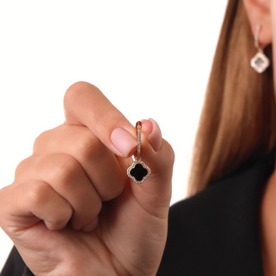 Серьги с 20 бриллиантами природными, 0.15 карат, огранка круг 17 граней, цвет 2, чистота 2, тип огранки А; 48 бриллиантами природными, 0.2 карат, огранка круг 17 граней, цвет 2, чистота 2, тип огранки А; эмаль черная; Розовое золото 585 пробы.