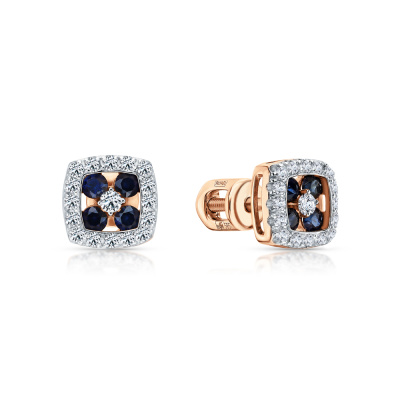 Серьги с 2 бриллиантами природными, 0.02 карат, огранка круг 57 граней, цвет 3, чистота 6; 32 бриллиантами природными, 0.15 карат, огранка круг 17 граней, цвет 2, чистота 2; 8 сапфирами природными, 0.3 карат, цвет 2, чистота 2; Розовое золото 585 пробы.