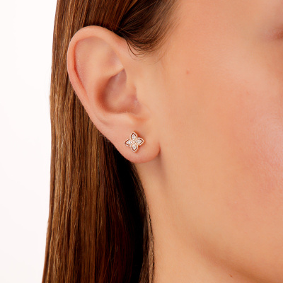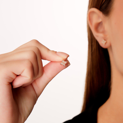 Серьги с 32 бриллиантами природными, 0.08 карат, огранка круг 17 граней, цвет 2, чистота 2, тип огранки А; Розовое золото 585 пробы.