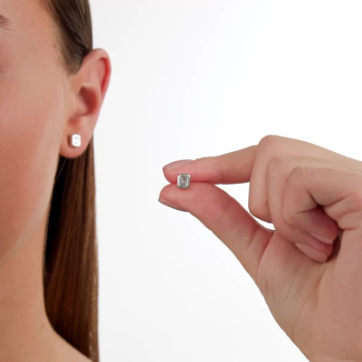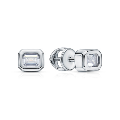 Серьги с 2 бриллиантами выращенными, 1.1 карат, огранка изумрудная 65 граней, цвет 4, чистота 5, тип огранки А; Белое золото 585 пробы.
