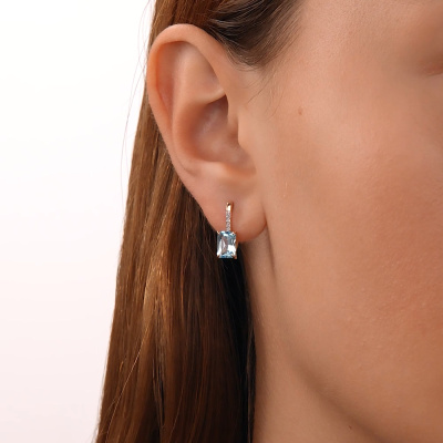 Серьги с 8 бриллиантами природными, 0.03 карат, огранка круг 17 граней, цвет 2, чистота 2, тип огранки А; 2 топазами скай природными, 2.28 карат; Розовое золото 585 пробы.