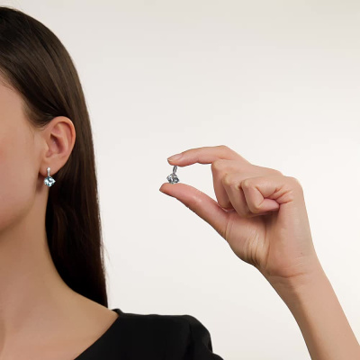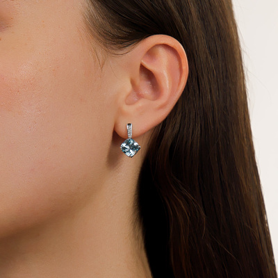 Серьги с 10 бриллиантами природными, 0.03 карат, огранка круг 17 граней, цвет 2, чистота 2, тип огранки А; 2 топазами скай природными, 5.29 карат; Белое золото 585 пробы.