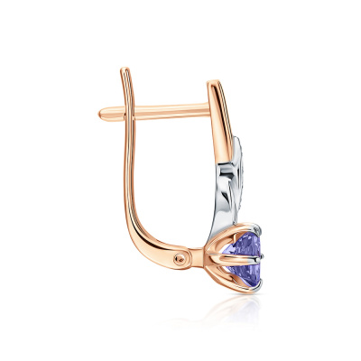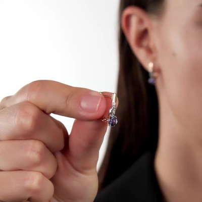 Серьги с 6 бриллиантами природными, 0.02 карат, огранка круг 17 граней, цвет 2, чистота 2, тип огранки А; 2 танзанитами природными, 1.02 карат; Розовое золото 585 пробы.