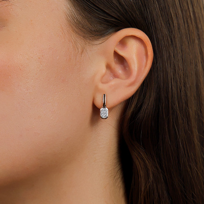 Серьги с 12 бриллиантами природными, 0.23 карат, огранка круг 57 граней, цвет 3, чистота 6, тип огранки А; 4 бриллиантами природными, 0.02 карат, огранка круг 57 граней, цвет 3, чистота 6, тип огранки А; 12 бриллиантами природными, 0.03 карат, огранка круг 17 граней, цвет 2, чистота 2, тип огранки А; Розовое золото 585 пробы.