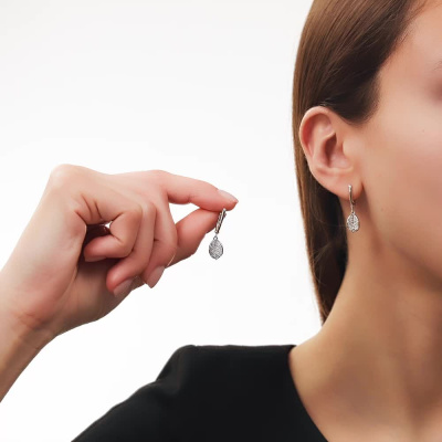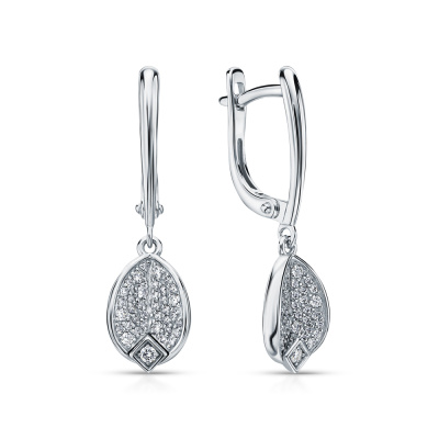 Серьги с 2 бриллиантами природными, 0.03 карат, огранка круг 57 граней, цвет 3, чистота 6, тип огранки А; 14 бриллиантами природными, 0.1 карат, огранка круг 57 граней, цвет 3, чистота 6, тип огранки А; 58 бриллиантами природными, 0.13 карат, огранка круг 57 граней, цвет 3, чистота 6, тип огранки А; Белое золото 585 пробы.