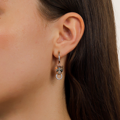 Серьги с 48 бриллиантами природными, 0.17 карат, огранка круг 17 граней, цвет 2, чистота 2, тип огранки А; 4 изумрудами природными, 0.02 карат, цвет 3, чистота 3; 6 бриллиантами черными природными облагороженными, 0.02 карат, огранка круг 57 граней, цвет 7, чистота 6, тип огранки А; Розовое золото 585 пробы.