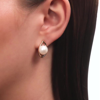 Серьги с 20 бриллиантами природными, 0.06 карат, огранка круг 17 граней, цвет 2, чистота 2, тип огранки А; 2 жемчугами пресноводными культ.белыми; Розовое золото 585 пробы.