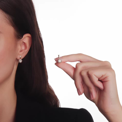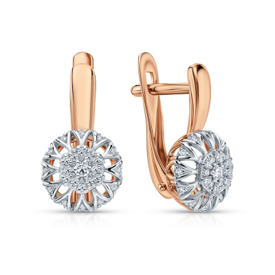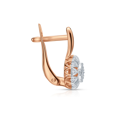 Серьги с 2 бриллиантами природными, 0.03 карат, огранка круг 57 граней, цвет 4, чистота 6, тип огранки А; 48 бриллиантами природными, 0.12 карат, огранка круг 17 граней, цвет 2, чистота 2, тип огранки А; Розовое золото 585 пробы.