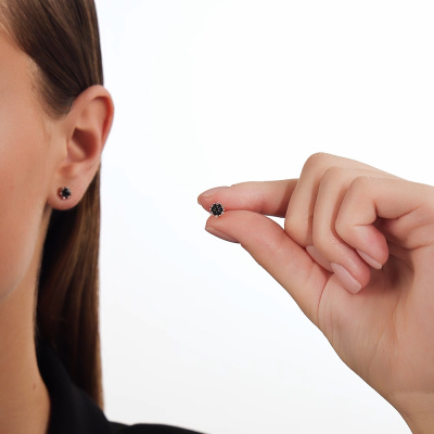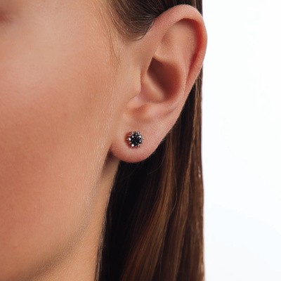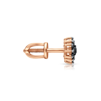 Серьги с 12 бриллиантами природными, 0.04 карат, огранка круг 17 граней, цвет 2, чистота 2, тип огранки А; 2 сапфирами черными природными, 0.08 карат; 12 сапфирами черными природными, 0.23 карат; Розовое золото 585 пробы.