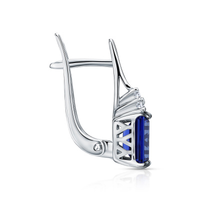 Серьги с 2 сапфирами выращенными, 2.47 карат; 6 бриллиантами выращенными, 0.07 карат, огранка круг 57 граней, цвет 3, чистота 5, тип огранки А; Белое золото 585 пробы.