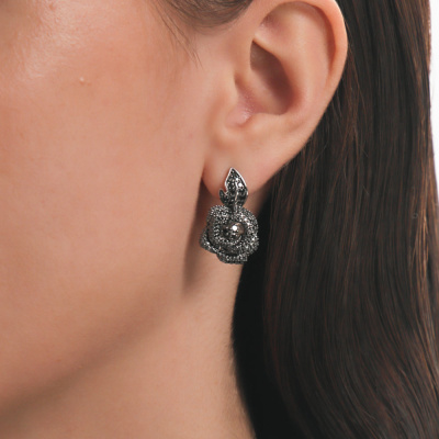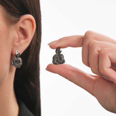 Серьги с 2 бриллиантами черными природными облагороженными, 0.07 карат, огранка круг 57 граней, цвет 7, чистота 6, тип огранки А; 4 бриллиантами черными природными облагороженными, 0.1 карат, огранка круг 57 граней, цвет 7, чистота 6, тип огранки А; 12 бриллиантами черными природными облагороженными, 0.19 карат, огранка круг 57 граней, цвет 7, чистота 6, тип огранки А; 8 бриллиантами черными природными облагороженными, 0.08 карат, огранка круг 57 граней, цвет 7, чистота 6, тип огранки А; 128 бриллиантами черными природными облагороженными, 0.58 карат, огранка круг 57 граней, цвет 7, чистота 6, тип огранки А; 158 бриллиантами черными природными облагороженными, 0.36 карат, огранка круг 57 граней, цвет 7, чистота 6, тип огранки А; Белое золото 585 пробы.