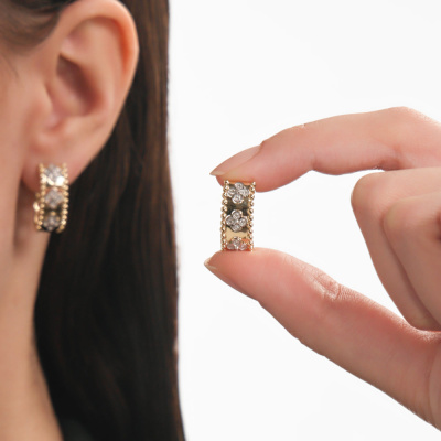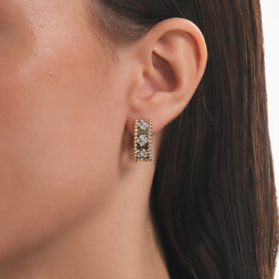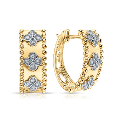 Серьги с 24 бриллиантами природными, 0.1 карат, огранка круг 17 граней, цвет 2, чистота 3, тип огранки А; Желтое и белое золото 585 пробы.