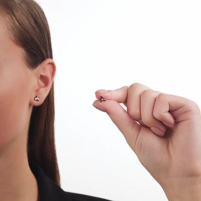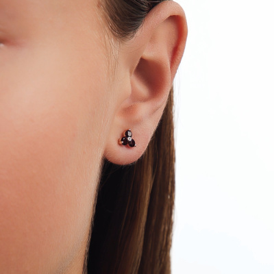 Серьги с 2 бриллиантами природными, 0.008 карат, огранка круг 17 граней, цвет 2, чистота 2, тип огранки А; 6 гранатами природными, 0.86 карат; силикон; Розовое золото 585 пробы.